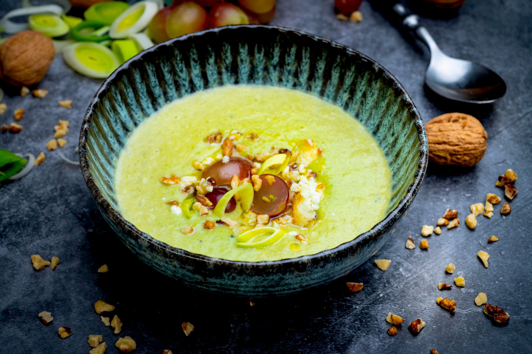 Rezept mit Lauch: Lauch-Suppe mit gegrilltem Ziegenkäse und Walnüssen